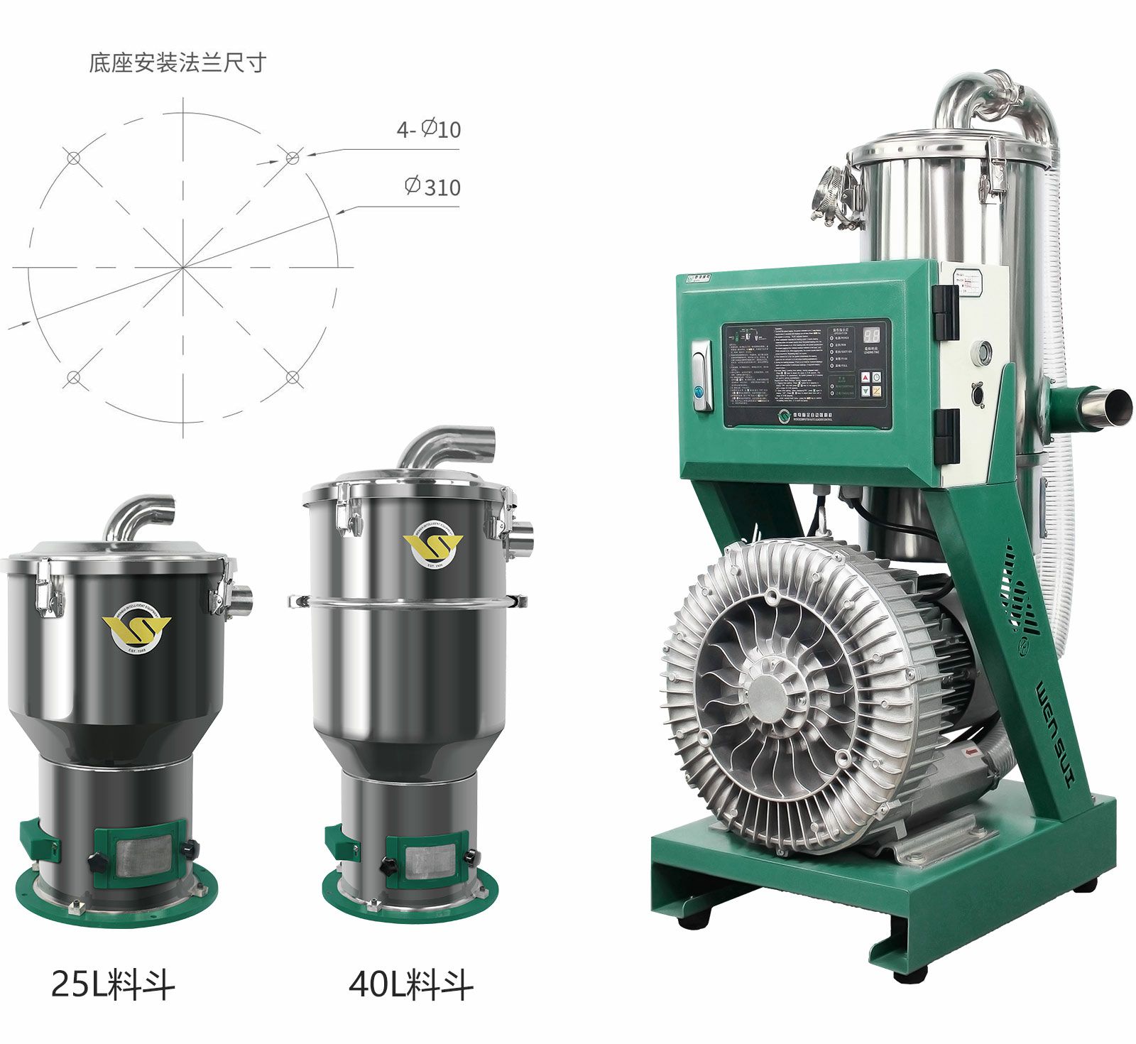 采用感应式高压风机,噪音少、寿命长,适合用于新料、回收料输送。